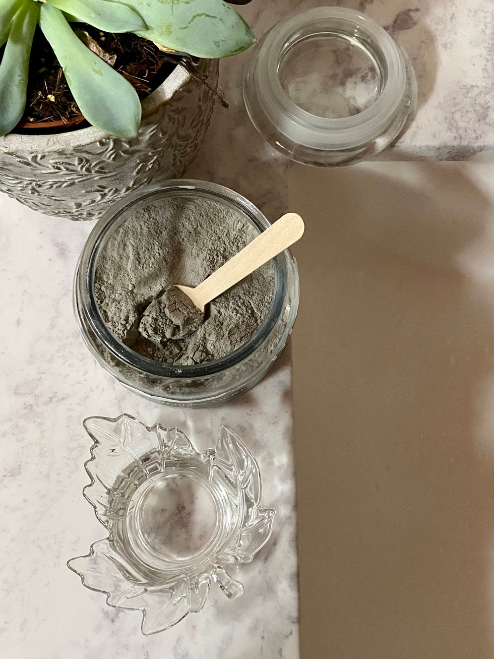 Mix 1 part clay to 1.5 parts water and 1.5 parts apple cider vinegar (or just 3 parts water or just 3 parts acv) Essential oils are optional.
